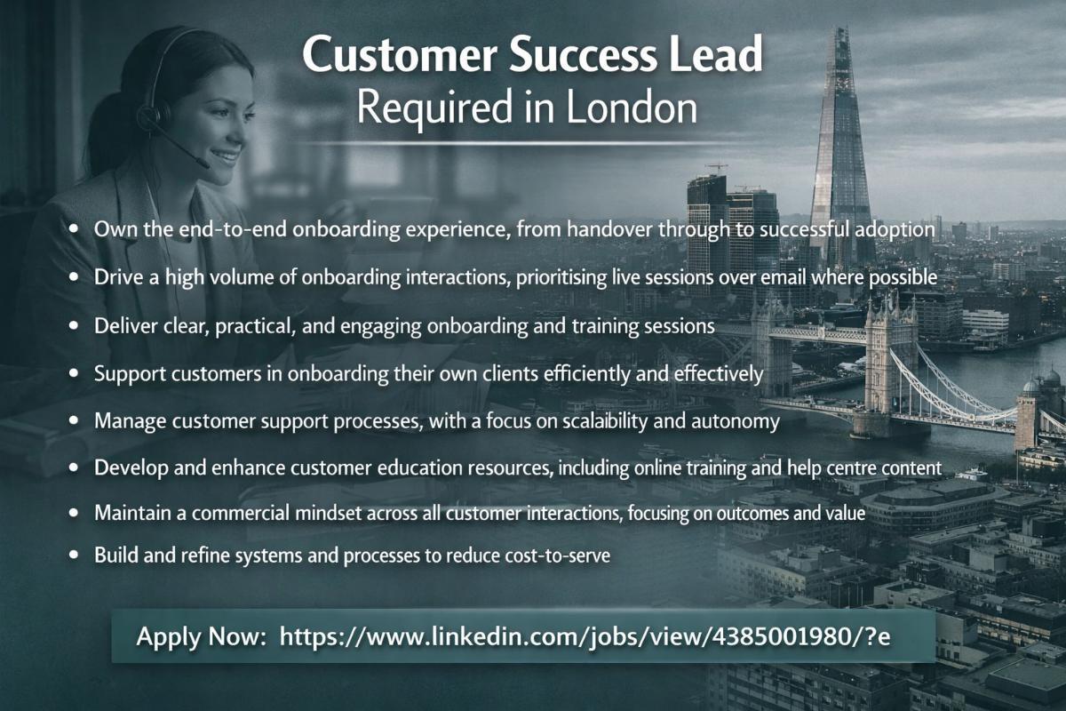 The Customer Success Lead will take full ownership of the post-sale customer journey, from closed won through to successful onboarding, adoption, and long-term retention.