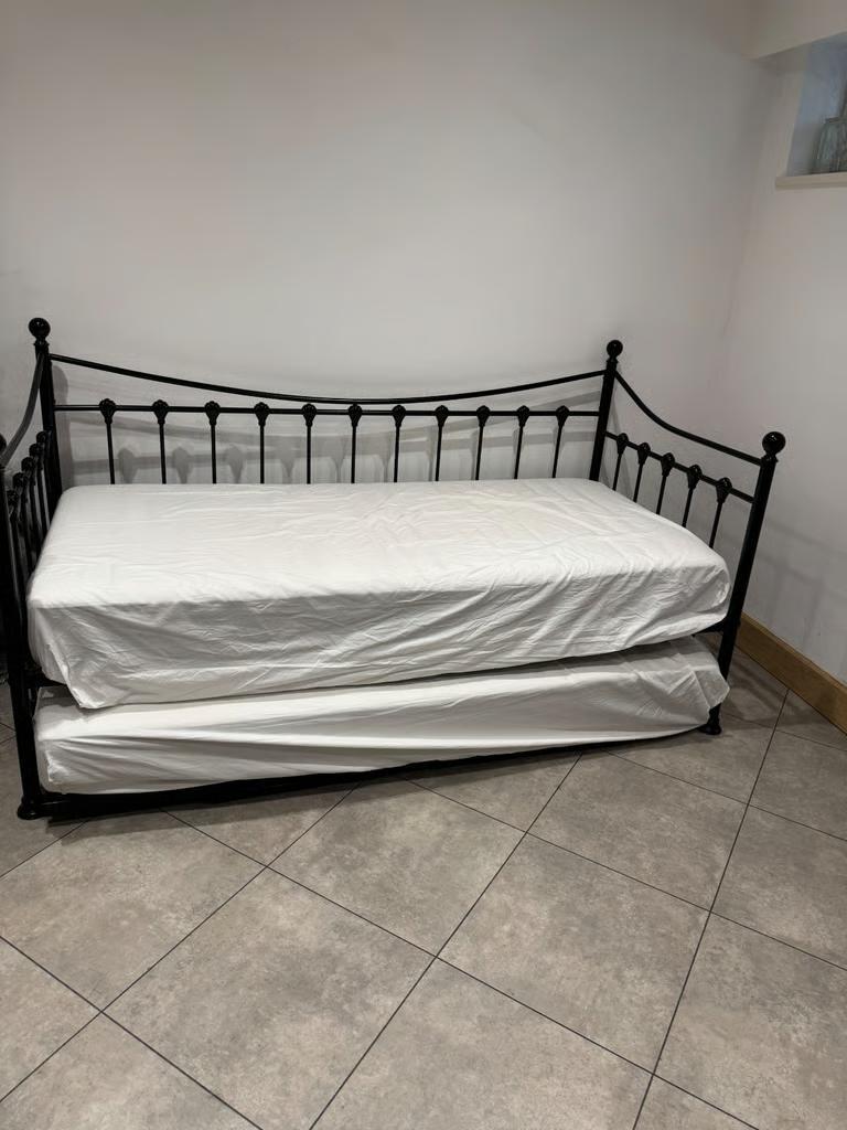 Day bed with trundle and two single mattresses with covers for sale. Day bed and trundle from wayfair , mattresses from ikea.
