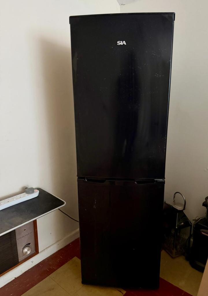 Narrow 47cm x 149cm high fridge freezer. One year old. Few surface scratches. £180 new