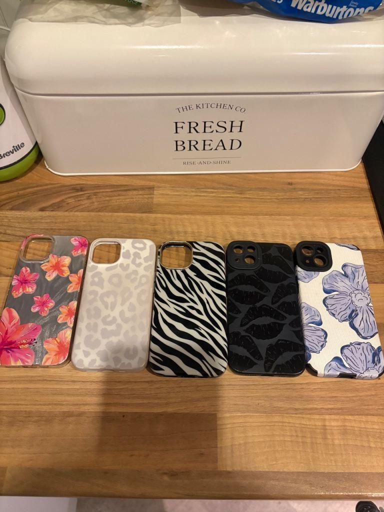 5 * I phone cases. They all fit I phone 13 and I phone 14. Looking to sell all together but may sell separately if requested. All in good condition as hardly been used. Any questions feel free to ask.