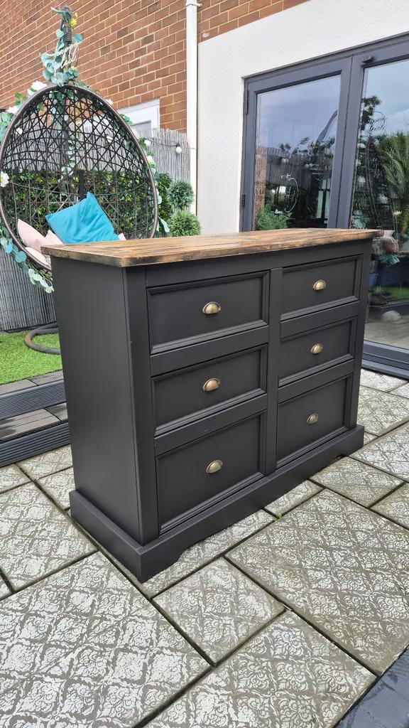 This impressive chest of drawers, constructed from solid wood in a striking black industrial style, is in great condition and offers ample storage capacity. Its dimensions are 133cm (L) x 48cm (W) x 104cm (H). Matching items available in separate listings. Collection from Houghton le Spring, DH4. Local delivery can be arranged for an additional fee, with the option of curbside delivery to the garden.