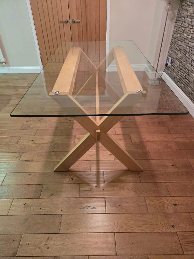 John Lewis table with glass top and oak legs.
