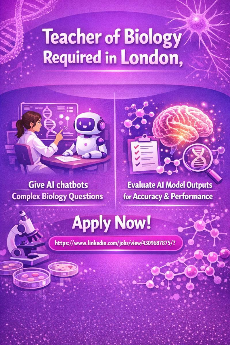 We are looking for a Teacher of Biology to join our team to train AI models. You will measure the progress of these AI chatbots, evaluate their logic, and solve problems to improve the quality of each model.