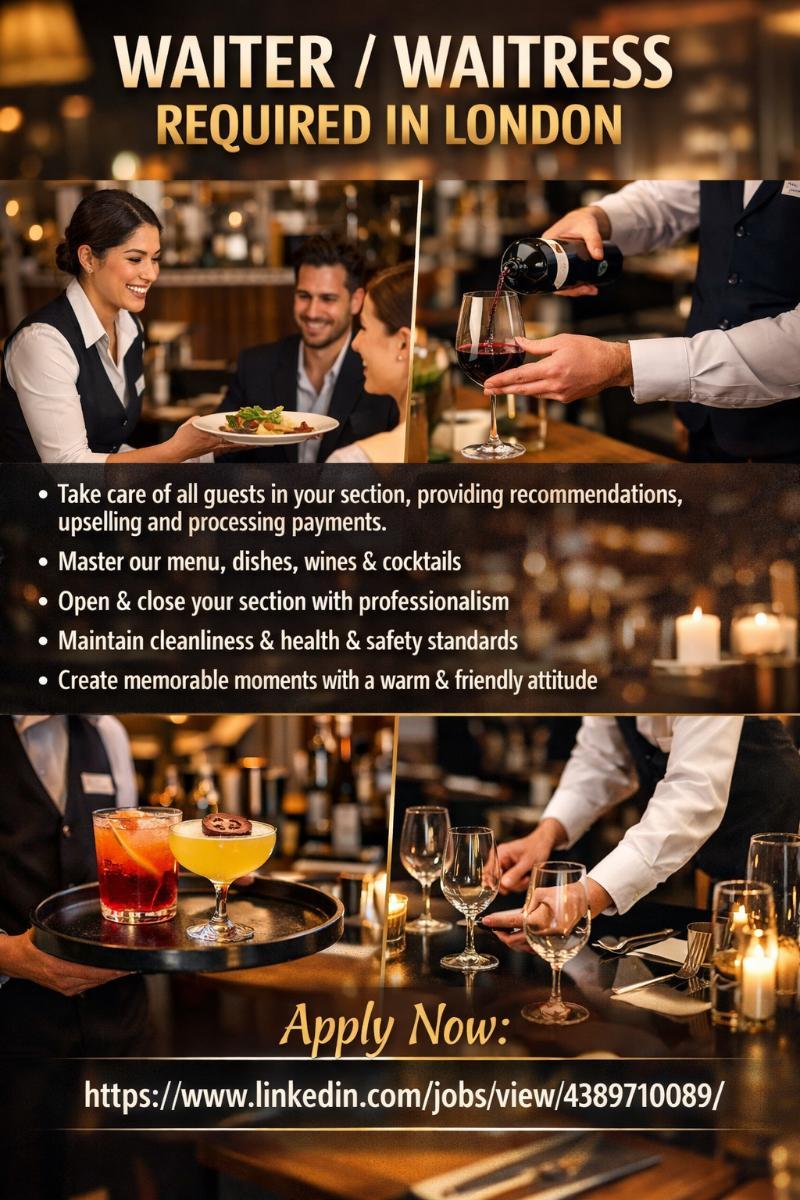 Strong communication skills and previous experience as a waiter/waitress in a busy restaurant